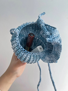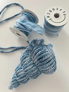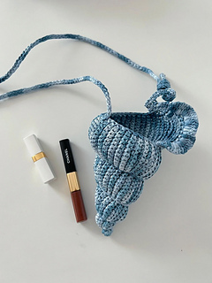 This pattern creates a cute seashell-shaped drawstring pouch inspired by ocean shells. The textured spiral design gives the pouch a realistic shell look, while the soft yarn and small pearl embellishments add a delicate and elegant touch. It is perfect for storing small items such as lip balm, jewelry, earbuds, or coins.