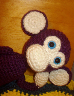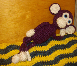 I used only part of a skein of purple yarn for this monkey with small amounts of white for the face, hands, feet and tip of the tail.