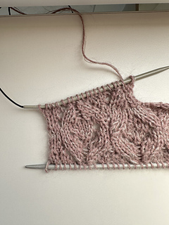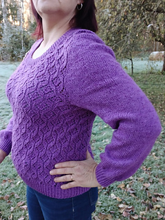 Short rows are used to higher the back neck line, there is a chart to get them worked in pattern. Stitches for the front are picked up from the cast on row, which will function as the shoulder seam. The sleeves are incorporated into the pattern from the start and are worked in stockinette stitch. Once set up, they are as easy as a raglan construction.