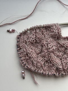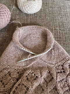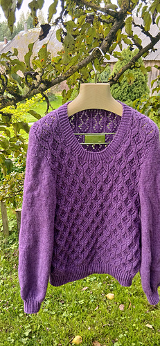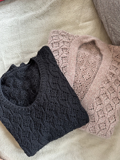 The cardigan features a beautifully soft double knitted button band. For the sweater, there are two versions: one with a steeked neckline, and one with the upper part worked back and forth. There are charts for the lace, which is worked on RS only.