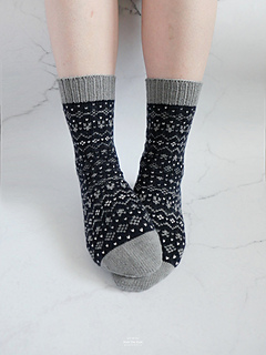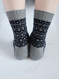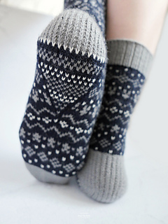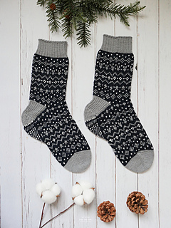 ‘Little Winter Socks’ are stranded colorwork socks featuring winter imagery depicted in simple line drawings.