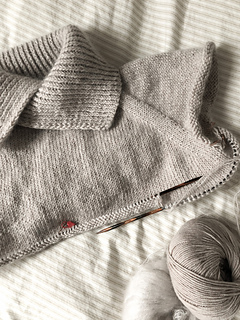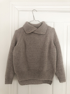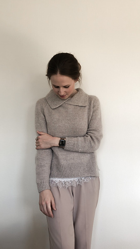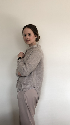The sweater is knitted from the top to bottom in ordinary stocking stitch and have a variety of fine and simple details. The sweater has an overlapping collar, and a slit from the waist and down in both sides.