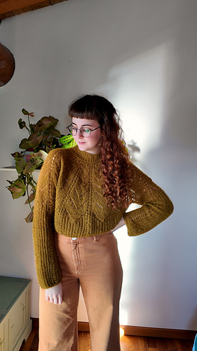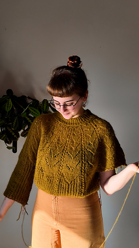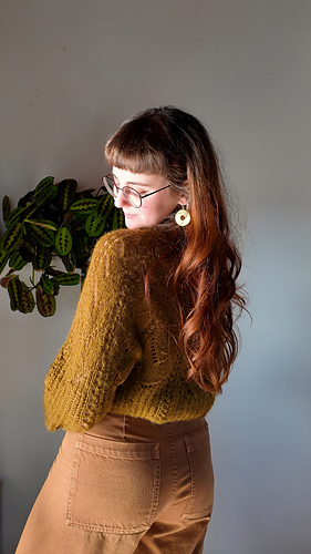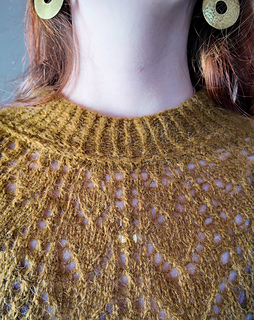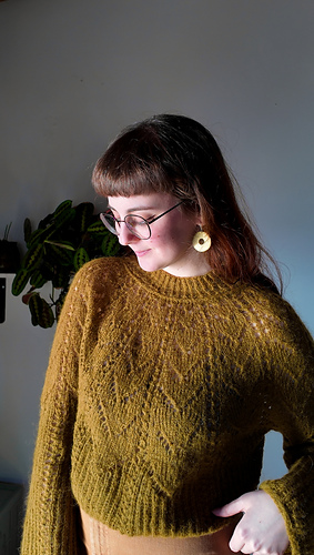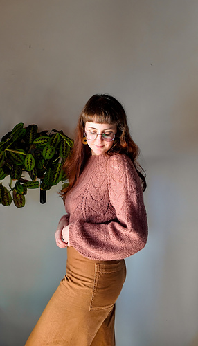 The blouse is designed with approximately 7–16 cm (3–5½ in) of positive ease and is knit using three strands of lace weight alpaca held together for a soft, airy texture.