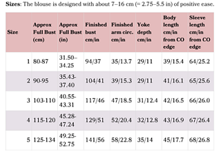 Sizes: The blouse is designed with about 7–14 cm (≈ 2.75–5.5 in) of positive ease (see size table in the photos)