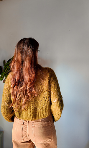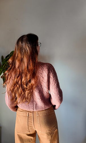 After the yoke, the pattern continues in brioche stitch combined with a five-stitch lace motif. The hem of the body is finished with an I-cord bind-off, and the sleeves are completed in the same way.