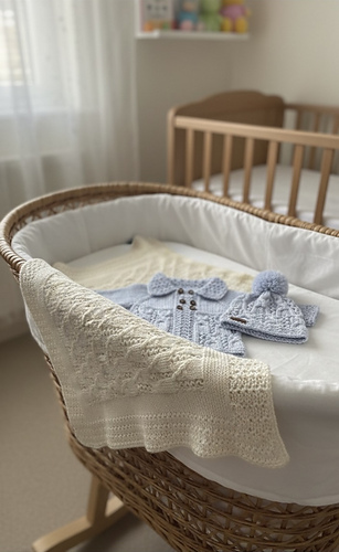 A beautiful Jacket, Hat and Blanket set knitted in DK yarn.
