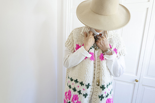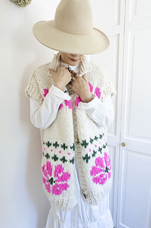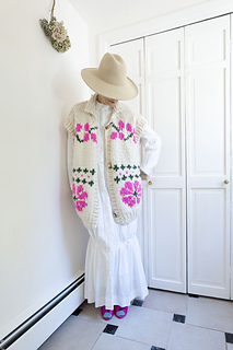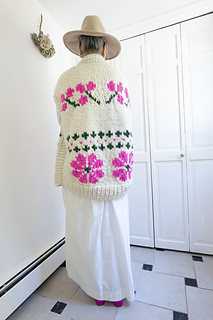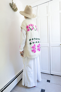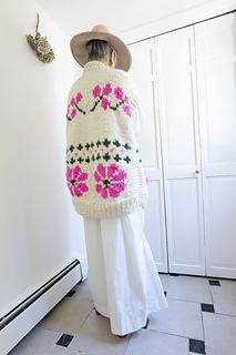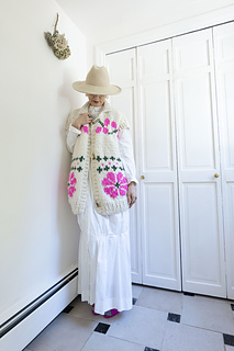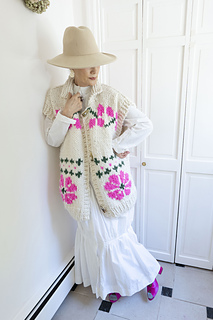 Merino No. 5 74 yards (68 m), 5.3 oz (150 g) each 100% merino wool yarn: 7 (7, 8, 8, 9) balls in Main Color (MC), 2 ball in Flower Color (FC), 1 ball in Leaf Color (LC)