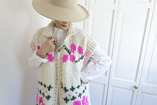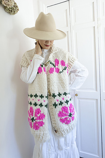 This vest is knit in three panels (two front and one back) that are seamed together at the shoulders and on the sides leaving arm openings. Panels are knitted flat from bottom up. All panels can be knit either on straight or circular needles. Collar is knit by picking up stitches around the neck. All panels feature stranded colorwork throughout. Tip: this project uses super bulky yarn for colorwork - you don’t have to carry the yarn for the rows or sections (edges of each panel) where MC or LC color is not used to prevent the garment from getting too heavy.