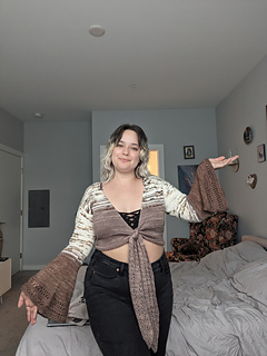 This tie-front top has a cropped length and is designed to hit at the natural waist in the back and angle up in front to tie at the bust. It is knit from the bottom up in one piece and joined at the shoulders. This top features a long bell sleeve with a lace cuff. Ties are knit in a dual-sided lace pattern with curved edges. Modifications are given to adjust body length and sleeve length.