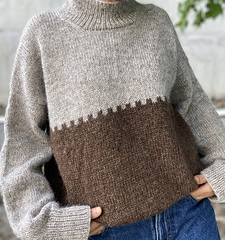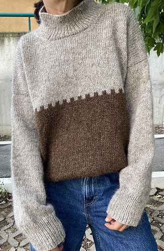 It is a drop shoulder sweater, with delicate purl details on the shoulders and a relaxed fit