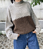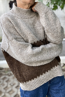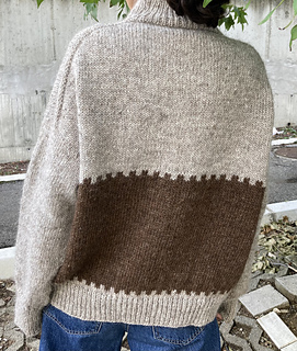 It is constructed from the top down. To start, the back shoulders and the back neck are shaped using short rows, then worked flat to the underarm. Then, pick up and knit stitches along both shoulder seams and work the two shoulder sections separately. Join the shoulder sections by casting on new stitches at the center front and finish working the front section. Now join the front and back sections and work the remainder of the body in the round.Once the body is finished, stitches will be picked up for the neckline and sleeves to work the in the round.The neck edge is worked in rib.