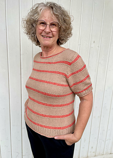 Starting with the neckline, the back and front top yoke. The sleeve stitches are then picked up and joined in the round before starting the first stripe. A small contrast row is added at the end at the cuffs. Line, the yarn of the Lotte shirt, not only wears well in high temperatures, it also knits well when it’s hot.