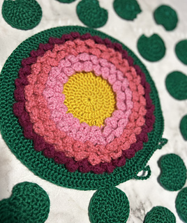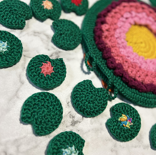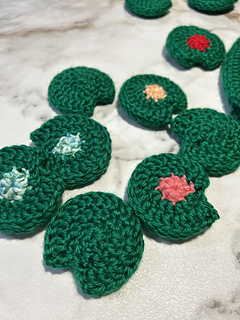 The game pieces are a great scrap buster, as you will only need a small amount of the colors for the pieces. You will also need a skein or two of green, three shades of pink and some yellow.