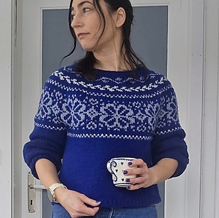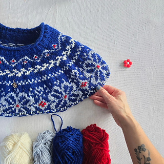 Pinnestørrelse: Bruk rundpinne og/eller settpinner 4 mm til halskanten, 4,5 mm til vrangborder, og rundpinne 5 mm til bærestykke, bol og ermer. For å unngå at mønsteret strammer på bærestykket, kan man med fordel gå opp til rundpinner 5,5 mm på mønsterdelen. Evt bruk de pinnestørrelsene du trenger for å få riktig strikkefasthet.