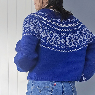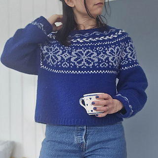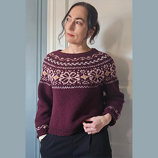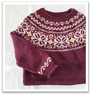 Det strikkes mønster på hele bærestykket, i tillegg er det en mønsterrapport nederst på ermene. Genseren strikkes i utgangspunket i 3 farger, men om ønskelig kan man også brodere på en fjerde farge i sentrum av blomstene (se bildet til venstre).