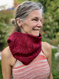 Love from Lisbon is worked flat and then seamed to form a continuous loop. It showcases a single feather and fan lace panel at the center, flanked by textured stockinette and garter‐stitch sections, all finished with an I-cord edge.