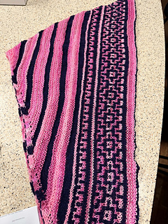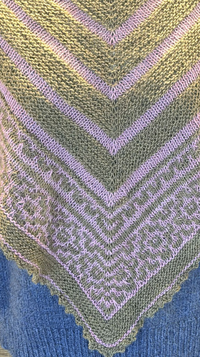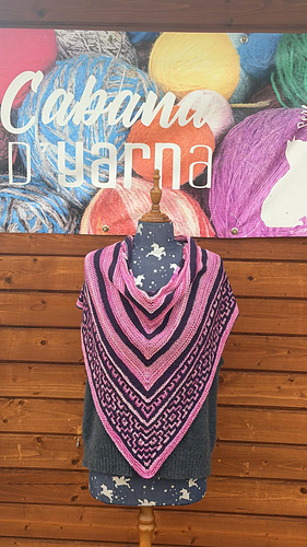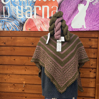 Worked top‑down from a garter‑tab start, the shawl grows into a soft, heart‑shaped triangle. Mosaic colourwork keeps things engaging while using only one colour at a time. The design is intentionally written to use 150 g / 600 m in total: 100 g / 400 m for the main colour and 50 g / 200 m for the contrast.