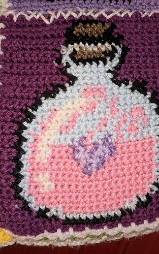 This is a love potion tapestry pattern. It has uses 7 colors which can be replaced with any colors you like. Yarn and hook size can vary depending on the look/ size you want to achieve.