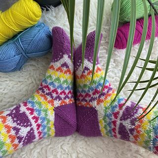 Techniques used: Forethought/Peasant Heel, Stranded Colourwork, Kitchener Stitch, Optional: Duplicate Stitch.