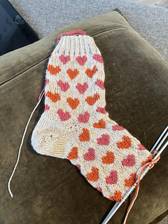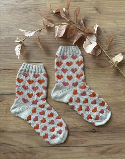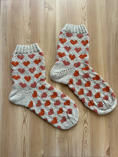 Søte sokkar med hjartemønster, strikka ovanfrå og ned.