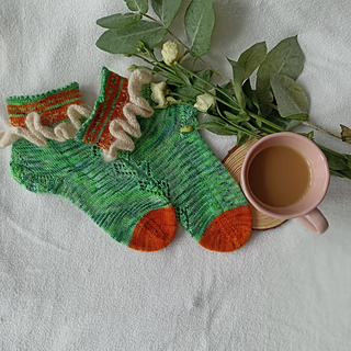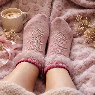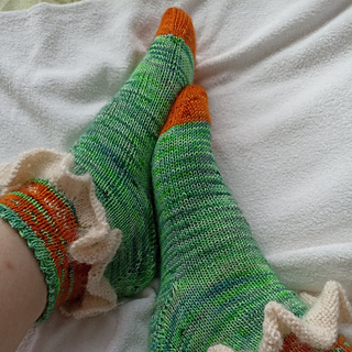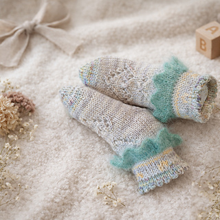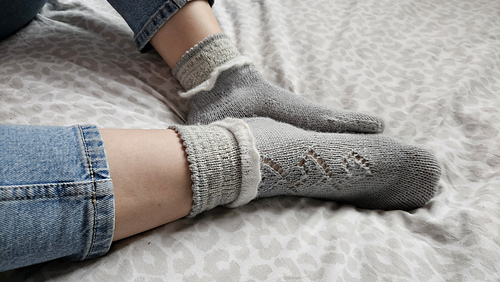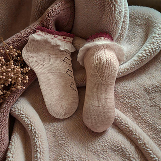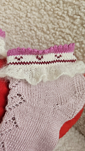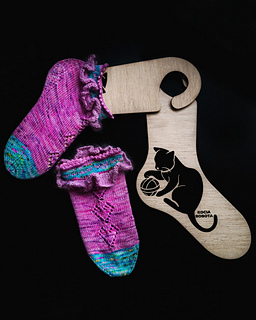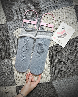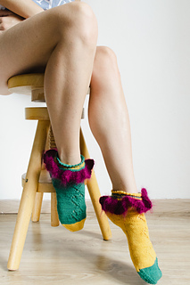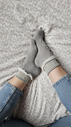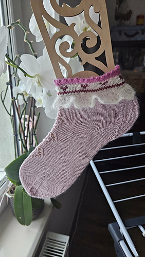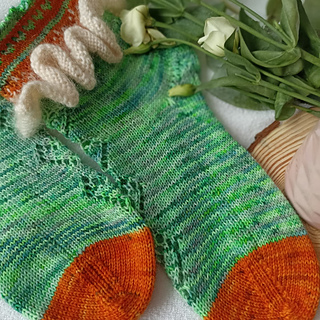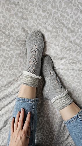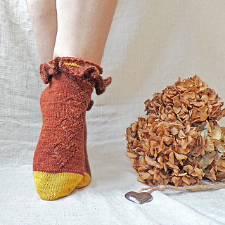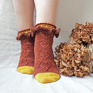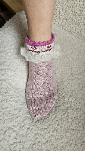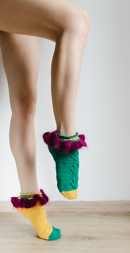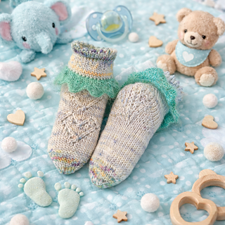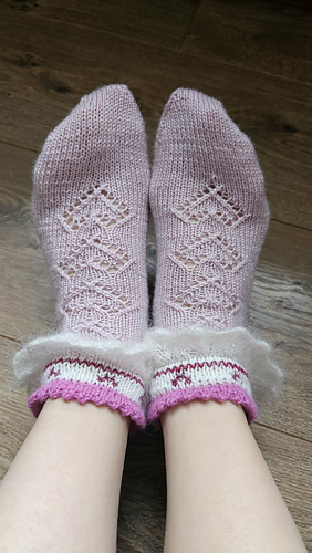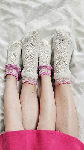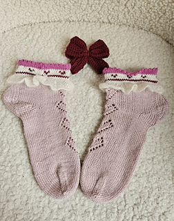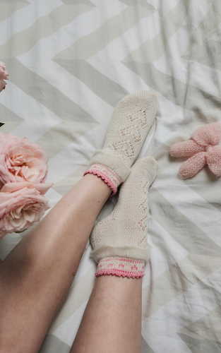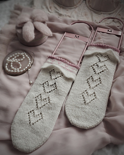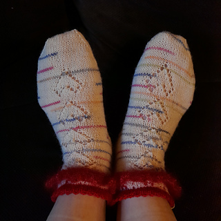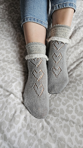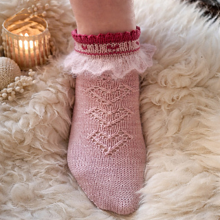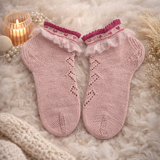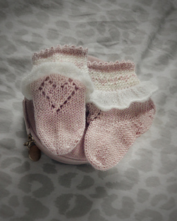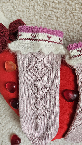 Love Me Crazy Socks are romantic socks with a theme centered around love and femininity. The design is rich in embellishments (hence the mention of “crazy” in the name).They are knitted from the top down: featuring picot and hearts on the colorworked cuff, followed by a ruffle just above the ‘diamond heel’ and lace hearts on the top of the foot.