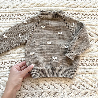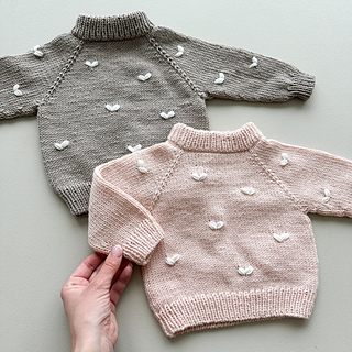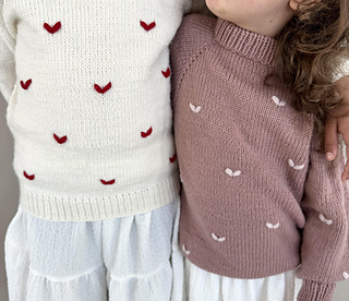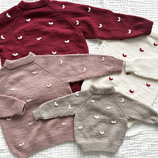 Loveyougenser er en enkel basicgenser med søte, små broderte hjerter på. Genseren strikkes ovenfra og ned med raglanøkninger. Den har dobbel halskant som strikkes ned. Loveyougenser er også ett perfekt prosjekt for å få brukt opp restegarn. Strikk den i striper, med eller uten hjerter på.