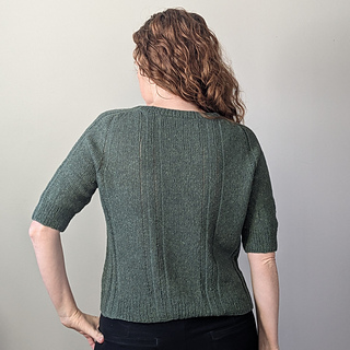 Lucid is knit from the top down and seamlessly using the contiguous shoulder and set-in sleeve method developed by Susie Myers. It is knit flat until the front neck is joined, then worked in the round down to the hem. The sleeve stitches are put on hold while the body is worked, then taken off of hold and worked down to the cuff. There are options for either short or long sleeves.
