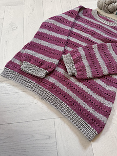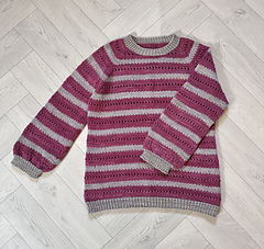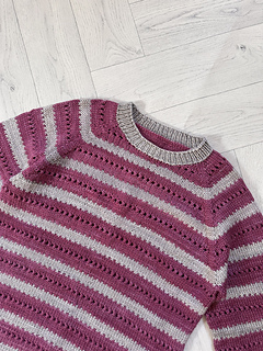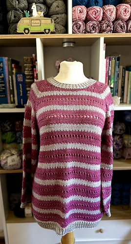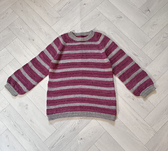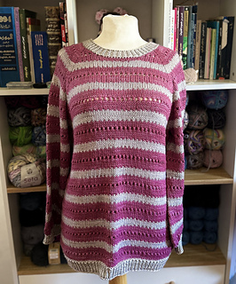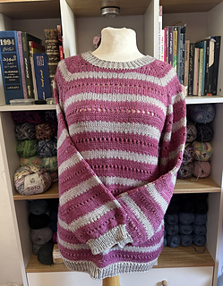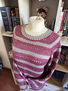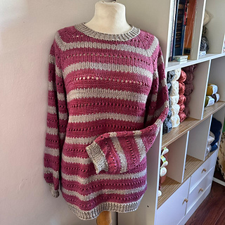 The pullover is knit seamlessly from the top down. First, a flat section is worked at the top. Then increases are made gradually to form raglan sleeves. After the raglan increases are completed, the work continues in a circular motion around the design until it is complete.