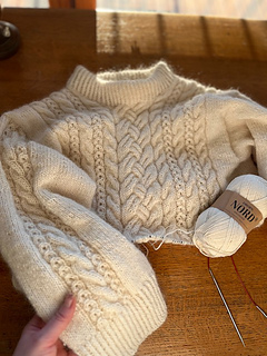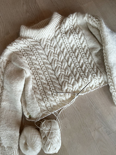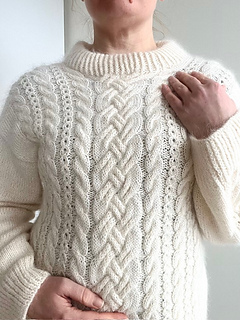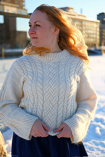 Lumi Pullover has a relaxed fit with dropped shoulders. It is knitted seamlessly top down and it has a variety of cables on the front side, stockinette stitch at back and on the sides.