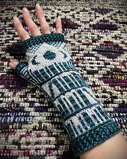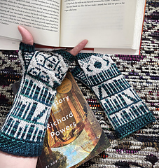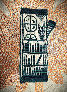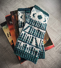 These whimsical fingerless mitts are an ode to books and a delightful addition to any avid reader’s knitwear collection. A tall bookshelf adorns the top and underside of these mitts, topped with a lunar motif on the hand side and a lovely little potted plant and window on the palm.