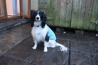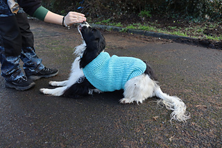 This free dog sweater knitting pattern is for a dog jumper, to fit dogs from 20 to 60 cm in length, measured from collar to base of tail. It is a beginner friendly pattern which is easy to knit. Designed for dogs with stiff legs who can’t easily pop their legs into a typical dog sweater, this jacket fastens under the tummy