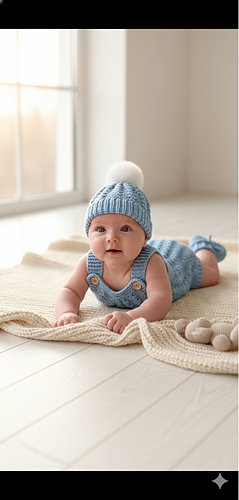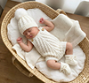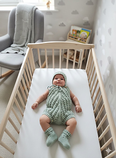 This beautiful pattern creates a cosy, sleeveless baby romper, a matching bobble hat, and adorable booties—a complete set perfect for newborns and infants. The design features a lovely eyelet design and is an excellent choice for a Christening outfit, newborn photoshoot, or a special gift.