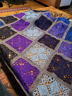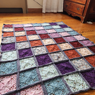 Two sizes are available: the small blanket is perfect as a lap blanket or to fit nicely into a crib or stroller; the large blanket is a great size for a throw. Both blankets are made up of individual squares which are knit from the center out in a floral and lace pattern beginning with a pinhole cast on. Links to helpful videos are included. Pattern includes both charted and written instructions. Squares are seamed together after blocking.