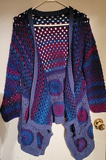 It is worked from the top down for the bodice and sleeves. The Peplum is worked in squares that are joined as you go and then crocheted onto the bodice.