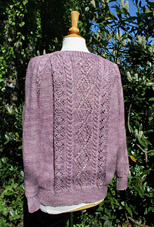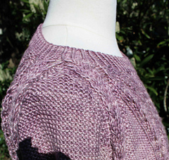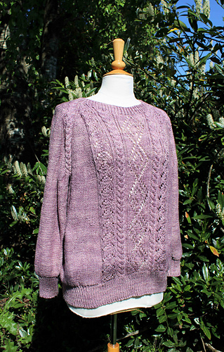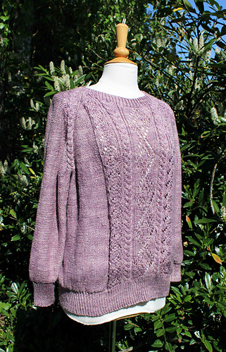 Lyngby (women) is a pullover that can be worn with no ease or with positive ease. Lyngby has a nice texured lace pattern on the body and long sleeves in reverse stockinette stitch. The pullover is worked from the bottom edge and up. The pullover has long sleeves and a raglan construction.