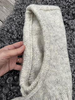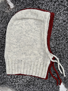 The upper part of the hood is worked flat. Stitches are then picked up along the sides and the hood is worked back and forth, while shaped with increases. After the shaping is completed, the hood is worked in the round.