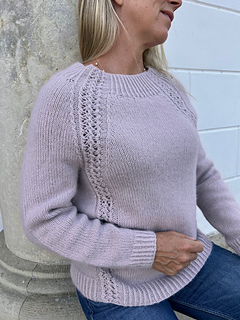 The sweater is knitted in the round from the bottom up. While the body is set aside, knit the sleeves, combine it all and continue knitting upwards with raglan decreases on each side of the lace patterns. Then knit short rows over the back and neck and on to the front piece, to make the Madicken sweater higher at the back and finish with a wide rib edge.