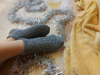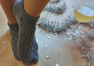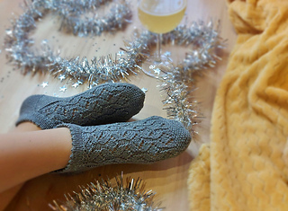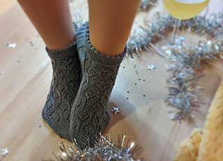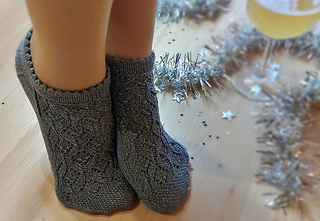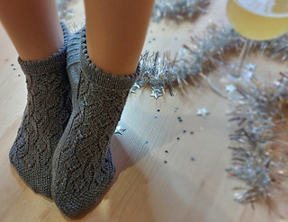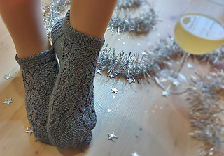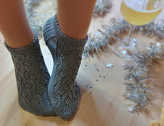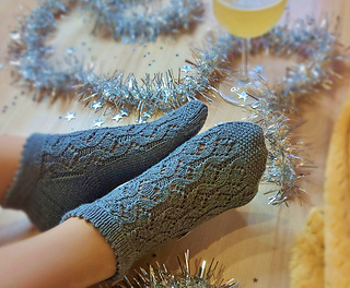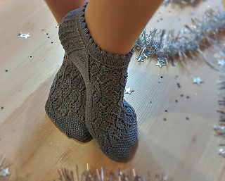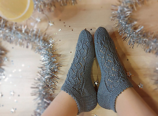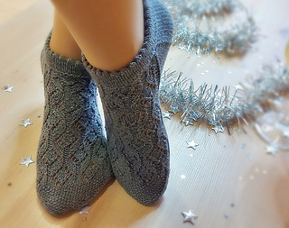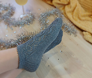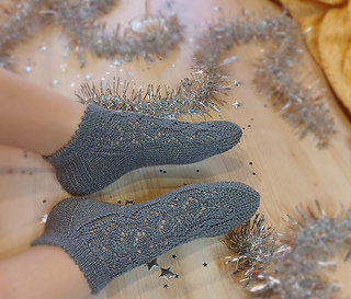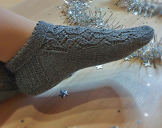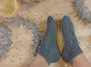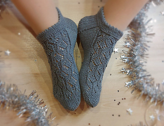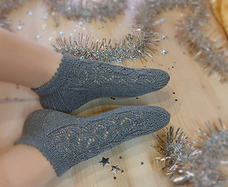 Skills required: basic knitting skills, decrease, increase, basic sock skills, short rows, heel flap, gusset, turning the heel, short row toe, lace, Kitchener stitch.