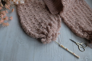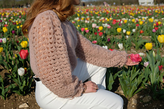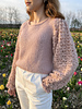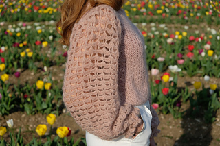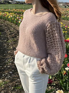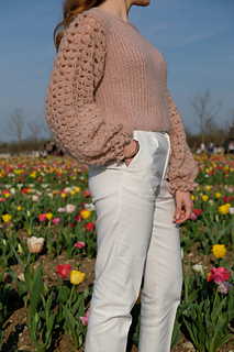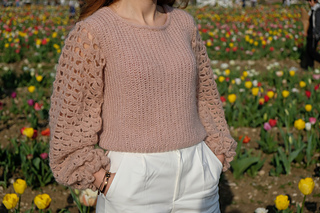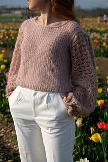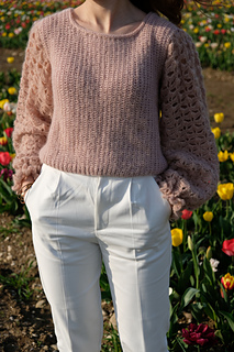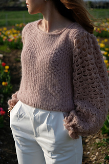 Meringa è una blusa raffinata ed allo stesso tempo comoda e calda. Ha uno stile romantico: realizzata nella lavorazione del corpo, con due ripetizioni di punti semplici che creano una texture moderna e basica; le maniche danno il tocco romantico al capo e realizzate anch’esse con punti semplici, basici e gradevoli da lavorare che creano un bellissimo traforo a pizzo. Per la lavorazione del corpo, si costruiranno due pannelli. Si inizierà lavorando un fianco della blusa, con giri di andata e ritorno, sviluppando la trama in verticale. Con aumenti e diminuzioni si andrà a sagomare ogni pannello. Dopo aver assemblato i due pannelli, si costruiranno le mani- che che verranno lavorate separatamente. Successivamente si cucirà ogni manica intorno alla circonferenza dell’apertura braccio, creando un’arricciatura a sbuffo nella parte superiore della spalla. Per la lavorazione