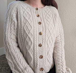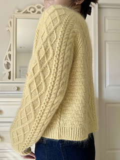 The Maisie cardigan is a vintage-inspired cabled cardigan. It’s worked top down in a modified raglan construction where the yoke and body are worked flat and the sleeves are worked in the round.