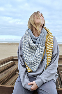The shawl features a non-regular triangular shape with an elongated colorwork corner, creating a soft, drapey, and comfortable fit.