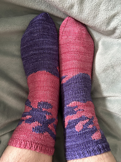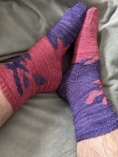 Inspired by the disagreement between two colourful fairies, these socks contain splotches along with a colour change at the foot. The socks are knit using intarsia, to avoid intarsia in the round, each round is finished by knitting the last stitch in the round with the YO formed at the start of the round. Option to do some Swiss darning for adding more splotches to limit amount of intarsia and weaving ends.
