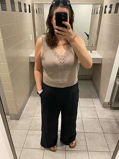 Mala Top features a stitch pattern modified from Norah Gaughan’s Twisted Stitch Sourcebook. To me, it resembles a mala necklace, which is sometimes worn in yoga practice. This top is worked from the top-down, beginning with the straps worked flat and separately. A simple twisted-stitch cable and lace pattern (worked without a cable needle) runs the length of the front straps and down the body of the garment. Garter edgings are worked in situ with the garment, so that stitches do not need to be picked up afterwards. The straps are joined to form the body, and the remainder of the garment is worked in the round, with the lace stitch pattern continuing to the hem, which is worked in twisted ribbing.