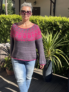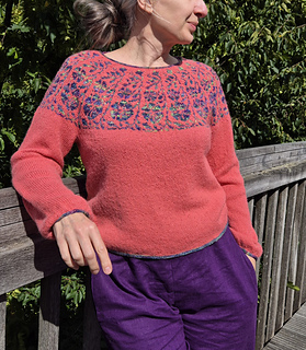 Malwa Sweater is a colorwork pullover with a circular yoke featuring a botanical motif, inspired by blooming hollyhocks. The pattern comes in two options: roosimine or stranded colorwork. The sweater is worked top down in the rounds, seamless. The length of the body and sleeves can be easily adjusted. The body is straight, same as sleeves which are only tapered at the wrist. The neckline, body and sleeves are finished with an i-cord. You can choose between a long-sleeved sweater or a short-sleeved tee.