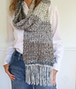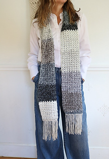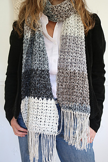 First, you will crochet the scarf in one long rectangle using the stitch pattern. Next, you can optionally block the scarf to even out the edges. Next, you will cut yarn to create fringe pieces for each short edge of scarf. Lastly, you will add the fringe pieces to each short edge of the scarf.