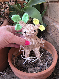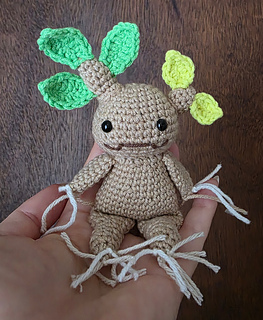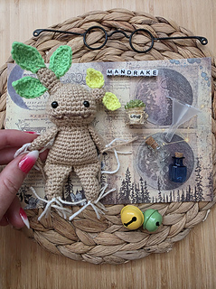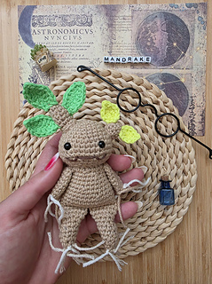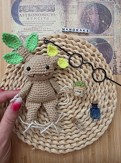 Baby Mandrake pattern - touch of magic! It is super cute. It easily sits by leaning against something as a decor. And it is a perfect size for a bag charm or keychain (14 cm full body length with leaves and 7 cm sitting without counting the branches). The pattern has dozens of pictures to guide you through the process.