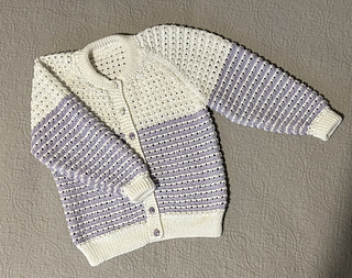 Instructions are given to knit the ribbed sleeve cuffs longer and start with the cuffs turned up. As your little one grows you can turn the cuffs down, meaning your cardigan will grow with your child.