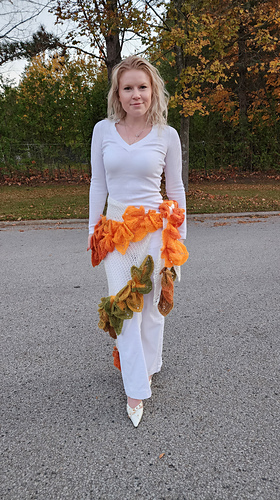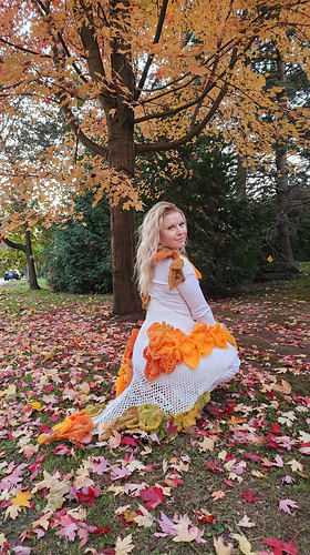 The Shawl is crochet with two (2) different stages, first is the shawl in NET stitch, and then leaves. The leaves are very fun to crochet, simple linear crochet that turns into the 3D, LEAF with DEFINITION- with simple linear motion, but when put together it looks like non-linear and gives the visual effect of a leaf. In my case, I am using 5-pointed leaf (because spreads and looks the most pleasant and eye-catching, elegant and beautiful). The variegated color yarn will give you the different shades of colors and therefore the leaves will be each different, looking like the real one. The 3D effect gives the natural looks of a leaf, the leaf that fell on the ground, it is still on the tree, the one that stayed green and that changed the color to the fall looking one. Leaf on its own is non-flat, it is 3D, and each leaf on the tree is a different – therefore I will show you how to make this 3D, this actual leaf look on a crochet leaf. And the placing of colors of leaves if also fun, also, you can add as many leaves as you wish to, you can follow my design (placing leaves on shawl) or you can do as you please, as per your imagination – it is your preference and choice, play with it and see what you like. The shawl (NET stitch can be done in any color you like – I chose white color, and white garments under the shawl, so it made the net shawl invisible (less noticeable) and the leaves are standing out, you can do black net shawl, or any color you like – and for the best results: make the net shawl in the color you will wear your clothes, so the leaves will be outstanding, contrasty and visible. The shawl is stunning on its own, gorgeous to wear and you can wear anywhere: at the wedding, or any formal function, at the cottage, or street walk – the shawl’s beauty will glamour your natural beauty and you will “stand out nicely in the crowd.”