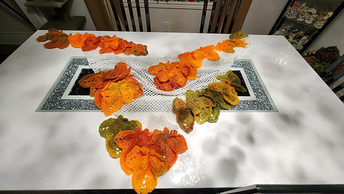 Leaves: 20 + (as per your desire) – I used 36 leaves and 2 yarn balls of 100g = 200g of color variegated thin/lace yarn