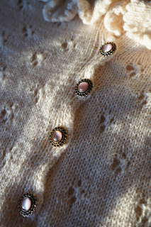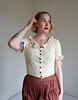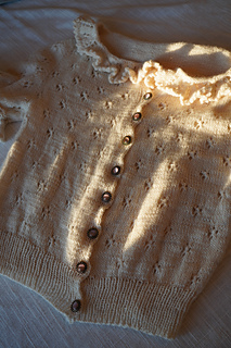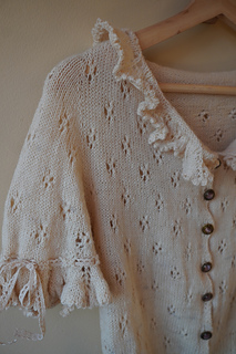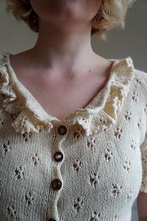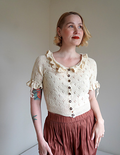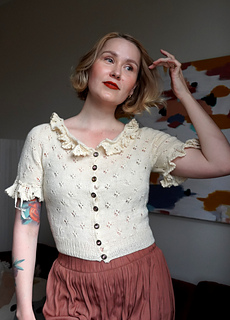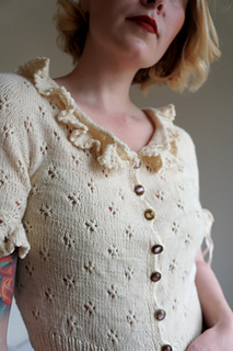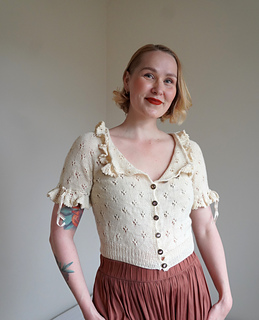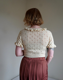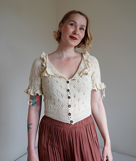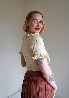 The Margot Blouse is a romantic short sleeved blouse with a delicate diamond lace pointelle pattern, ruffled lace cuffs and a lace collar. It is worked top down. The perfect, idyllic summer top!